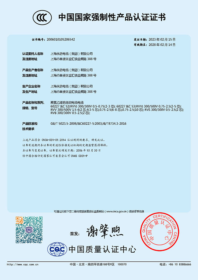 中國國家強制性產(chǎn)品認證證書-聚氯乙烯絕緣聚氯乙烯護套電纜