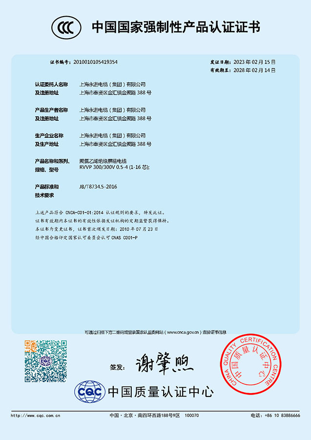 中國國家強制性產(chǎn)品認證證書-聚氯乙烯絕緣屏蔽電線